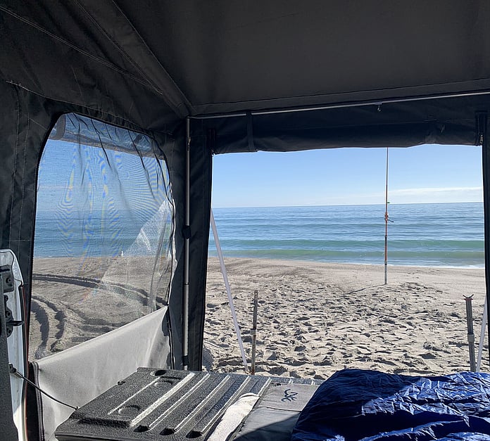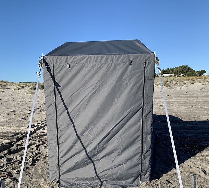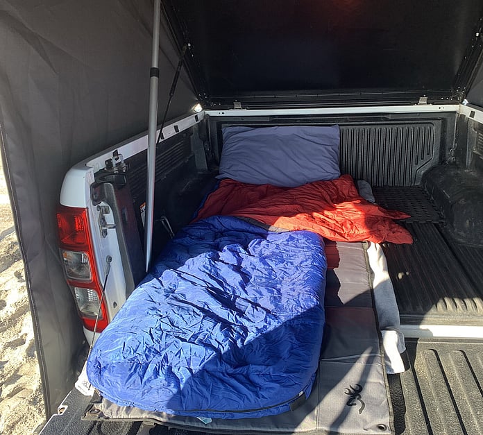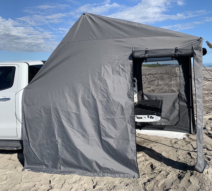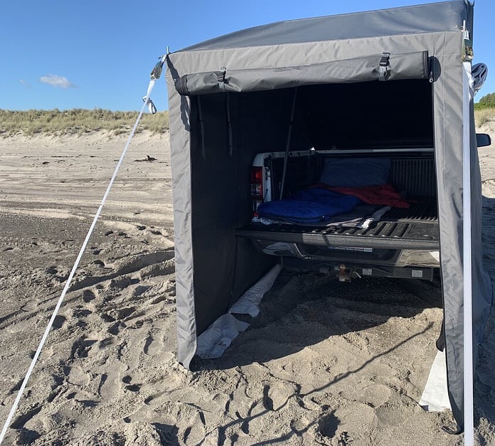 A HOOTCH is amazingly versatile; you can sleep in it, you can stand in it, you can sit in a chair in it, you can use the tailgate of the well-side as a table to cook or prep on or even hang a solar shower in it, and you can even use it as a 'self-contained' unit if need be; its versatility is endless.